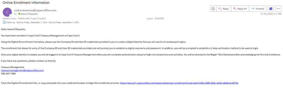 After downloading the app, click the Digital ID enrollment link in the email you received from Cape Cod 5. The image below is an example of the email.