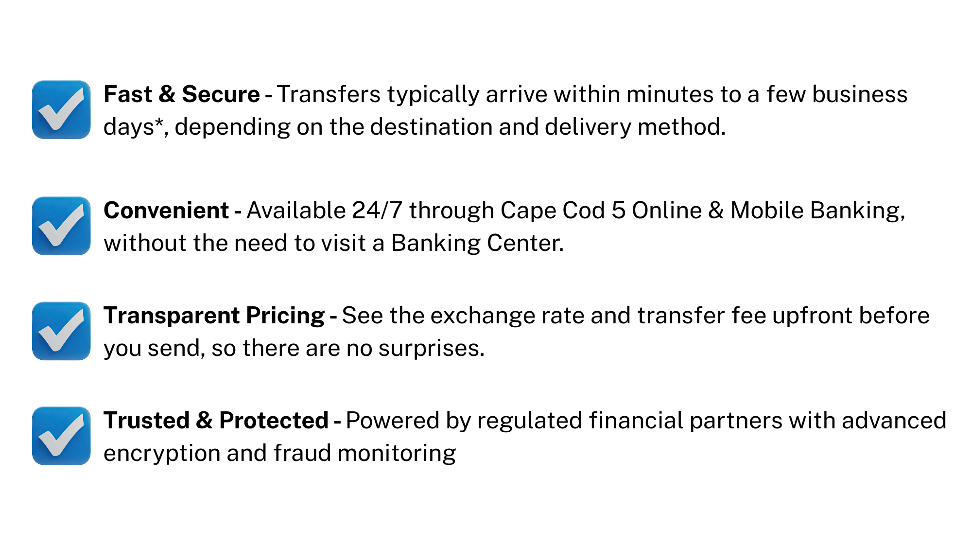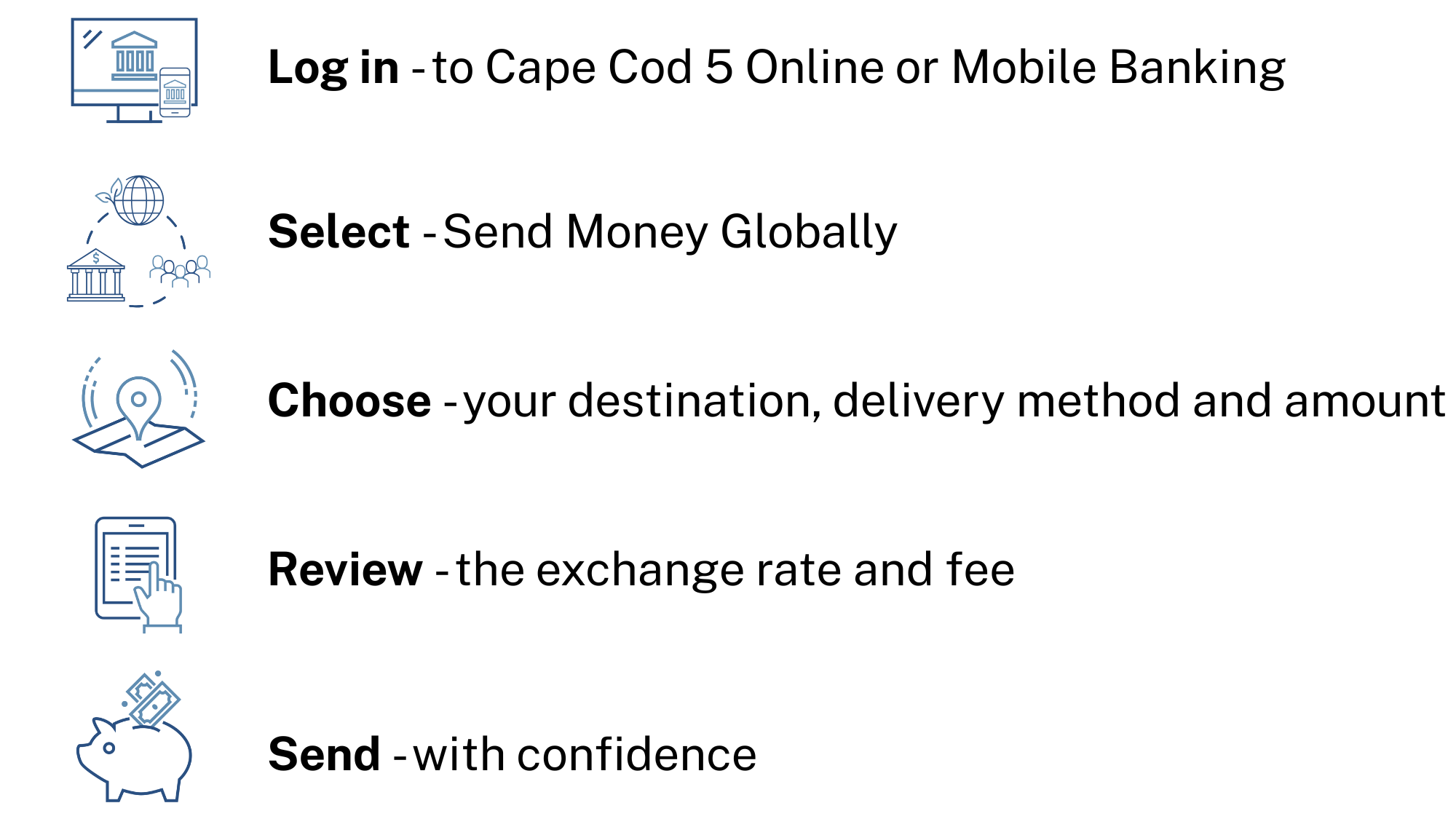 With Send Money Globally, you can send international transfers directly from your Cape Cod 5 checking account to loved ones in over 15 countries, all within the Cape Cod 5 Mobile App or Online Banking. Whether you’re supporting family, helping with tuition, or covering overseas expenses, sending money abroad is now more convenient than ever.
