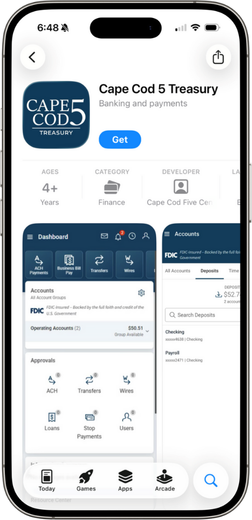 On or after Monday, October 27, download the new Cape Cod 5 Treasury Banking Mobile App from the Apple® App Store (iOS) or Google Play™ (Android).